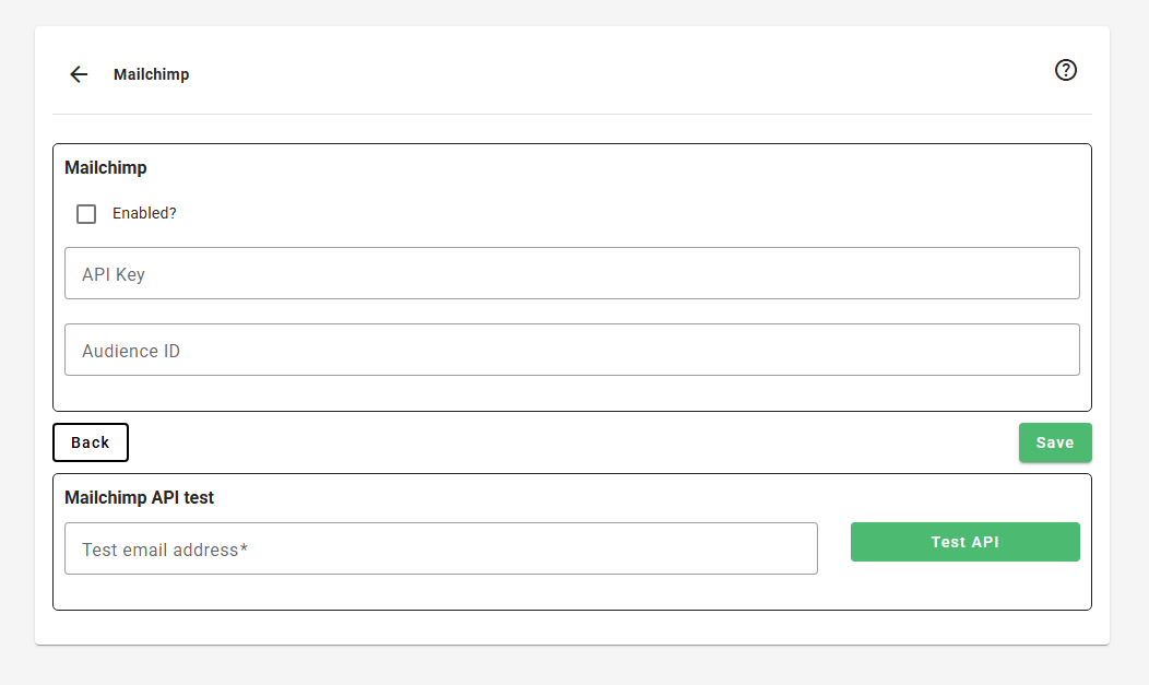 Once you’ve entered the API key and Audience ID into BRM, check the "Enabled" checkbox and click Save. You’re all set! To test the connection, enter an email address (e.g., "[email protected]") in the test email address field and click the Test API button. A success message should appear, and the test email will show up as a contact in your Mailchimp Audience. If you encounter an error, double-check the API key and Audience ID for accuracy.